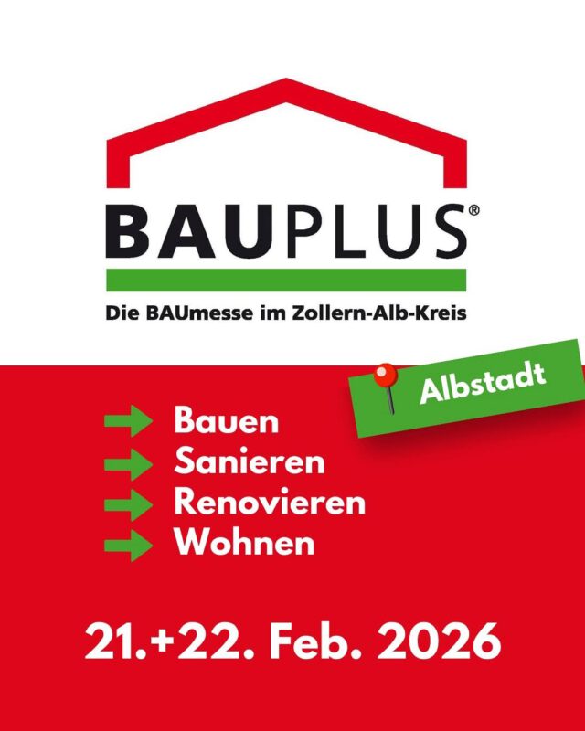 Am kommenden Wochenende findet die BAUplus – Die BAUmesse im Zollern-Alb-Kreis statt. Auch dieses Jahr sind wir wieder mit unserem Messestand vertreten. Gerne beraten Sie unsere Mitarbeiter zu unseren BETON-GARAGEN. Wir freuen uns, mit Ihnen ins Gespräch zu kommen. Der Eintritt ist frei.